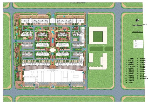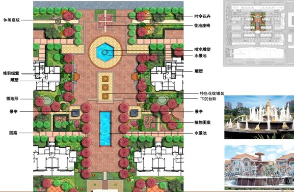 項目考慮“人、自然、空間”之間的和諧關(guān)系,堅持以人為本的設(shè)計理念,在設(shè)計中以生態(tài)環(huán)境優(yōu)先為原則,充分考慮建筑和景觀之間的關(guān)系,通過材料和造型的運用,將歐式建筑和新古典景觀進行風格樣式上的對接。在規(guī)劃的同時,輔以景觀設(shè)計,最大限度的體現(xiàn)居住區(qū)本身的底蘊。設(shè)計中結(jié)合當?shù)靥厣?,在小區(qū)中設(shè)置小區(qū)中心景觀軸線、橫向景觀帶、生態(tài)種植區(qū)等。在中心景觀軸線當中設(shè)置了歐式的矮墻噴泉、花溪疊瀑、下層廣場、噴泉水景等,使居民樂居其中。規(guī)劃設(shè)計注重園林景觀的可參與性,在小區(qū)內(nèi)設(shè)置開闊的硬質(zhì)景觀,如波紋鋪地、琴韻廣場等。小區(qū)內(nèi)公共空間、私密、半私密空間如:下層廣場和健康步道兩者的公共性和私密性設(shè)計對比強烈,動靜結(jié)合。通過不同的景觀設(shè)計,也為小區(qū)居民提供空間上充足、多樣的休閑、交往、活動場地,營造和諧、友善、溫馨的人際關(guān)系氛圍。