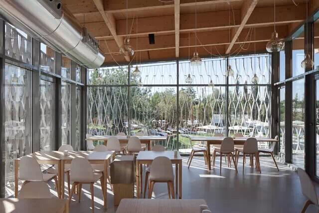 建筑面向泳池,底部挑空,二層大屋頂采用了更省材料的格柵式構(gòu)架,中心開一個方洞改善采光通風(fēng)條件。扶手欄桿的花紋與玻璃幕墻外的遮光柵欄的花紋一致,并合并為一個整體。